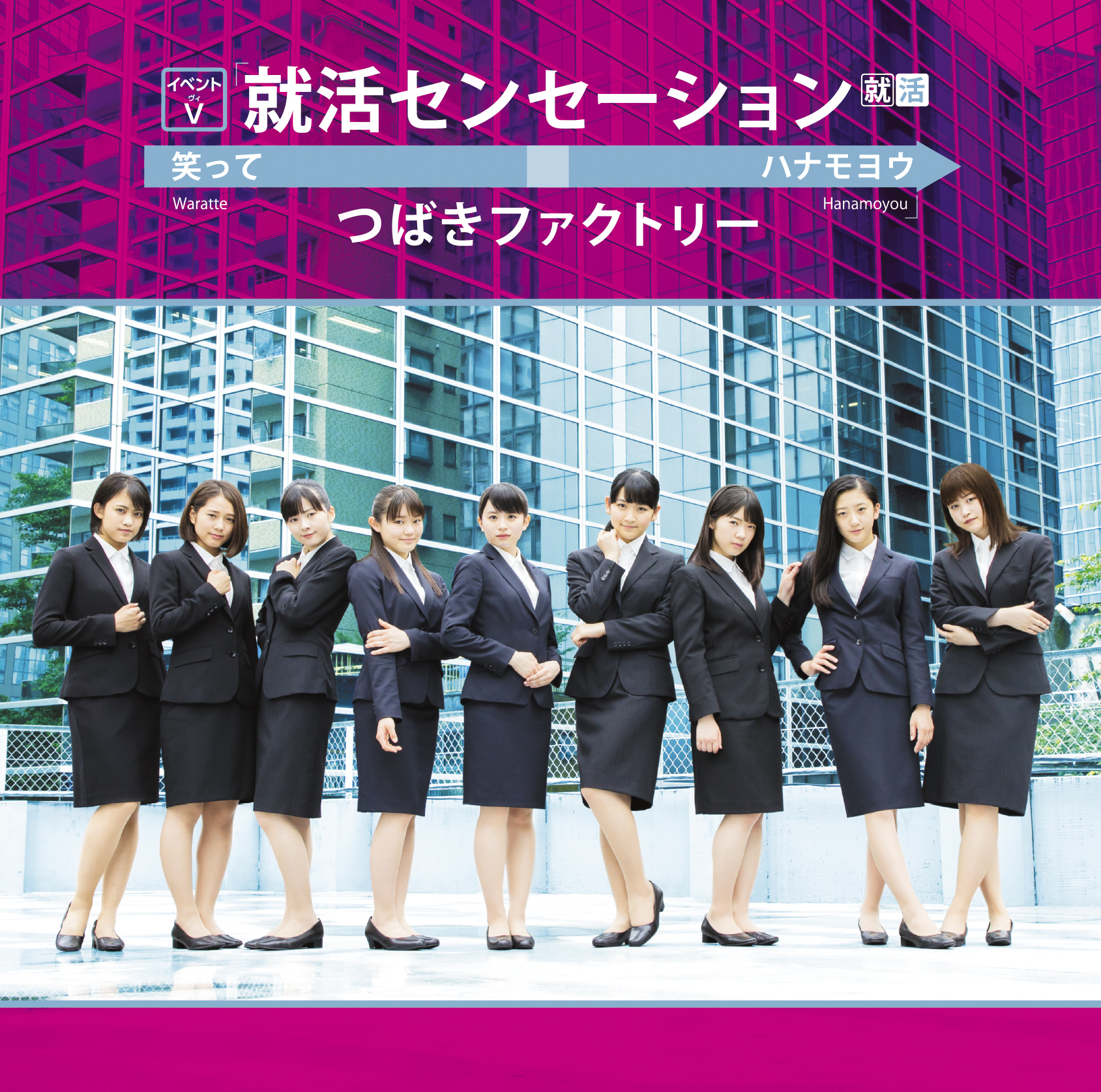 Shuukatsu Sensation / Waratte / Hana Moyou (就活センセーション/笑って/ハナモヨウ; Job-Hunting Sensation / Laugh / Floral Pattern) is Tsubaki Factory's 2nd single. It was released on July 26, 2017 in 7 editions: 3 regular and 4 limited. The first press of the regular editions included a random trading card of 10 kinds depending on the jacket (30 in total). The limited editions included an event lottery serial number card.